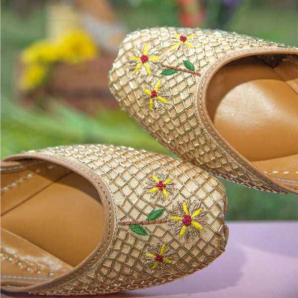 Guldasta: Step into subtle glamour with our jutti featuring a glamorous jaal and zari embroidery on a nude base. It creates a subtle yet captivating drama with every step you take. The impressive back of the jutti showcases an elegant beauty with a delicate web design that gracefully sways with your movements. This jutti is not only a treat for yourself but also makes a dream gift for your loved one. Inspired by radiant sunflower motifs, it embodies the essence of beauty and elegance.