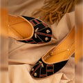 Nur: Embark on a mystical journey through our enchanting jutti, ‘Nur.’ Crafted with an elegant gold zardozi work, adorned with gleaming sequins, the minimalistic embroidery on the glossy, rich black velvet captures attention, enhancing the real beauty within you; this jutti symbolizes divine grace and radiance.